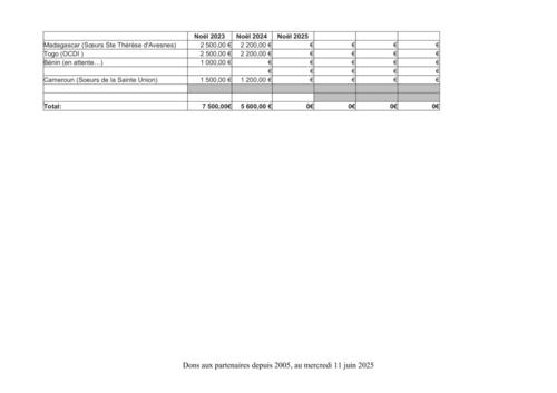 Pour le Bénin, suite au décès de Petite soeur Monique LAURENT, nous n'avons plus de correspondant dans ce pays actuellement... Les fonds qui leur étaient destinés n'ont pas pu être versés.