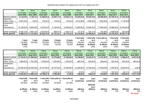 Les dépenses correspondent à la conception et à la réalisation des tracts et des affiches, et les premières années, à la réalisation de la video reprenant l'appel de Mgr Garnier, des DVD (un par paroisse).